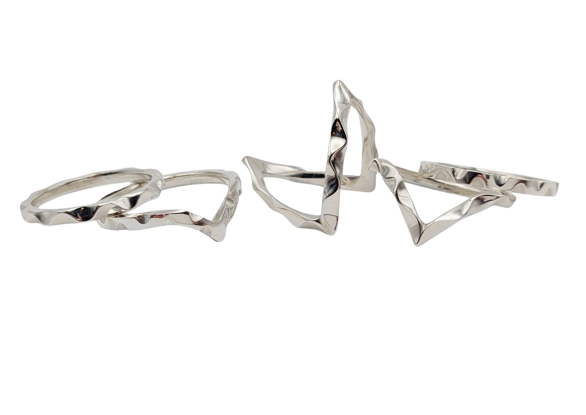 Inspired by the hidden structures and supports of urban architecture, the Geometric Collection transforms clean lines and industrial forms into bold, modern jewellery. Crafted from recycled sterling silver with accents of 22ct gold applied through the ancient keum-boo technique, these designs are playful, architectural, and effortlessly wearable.